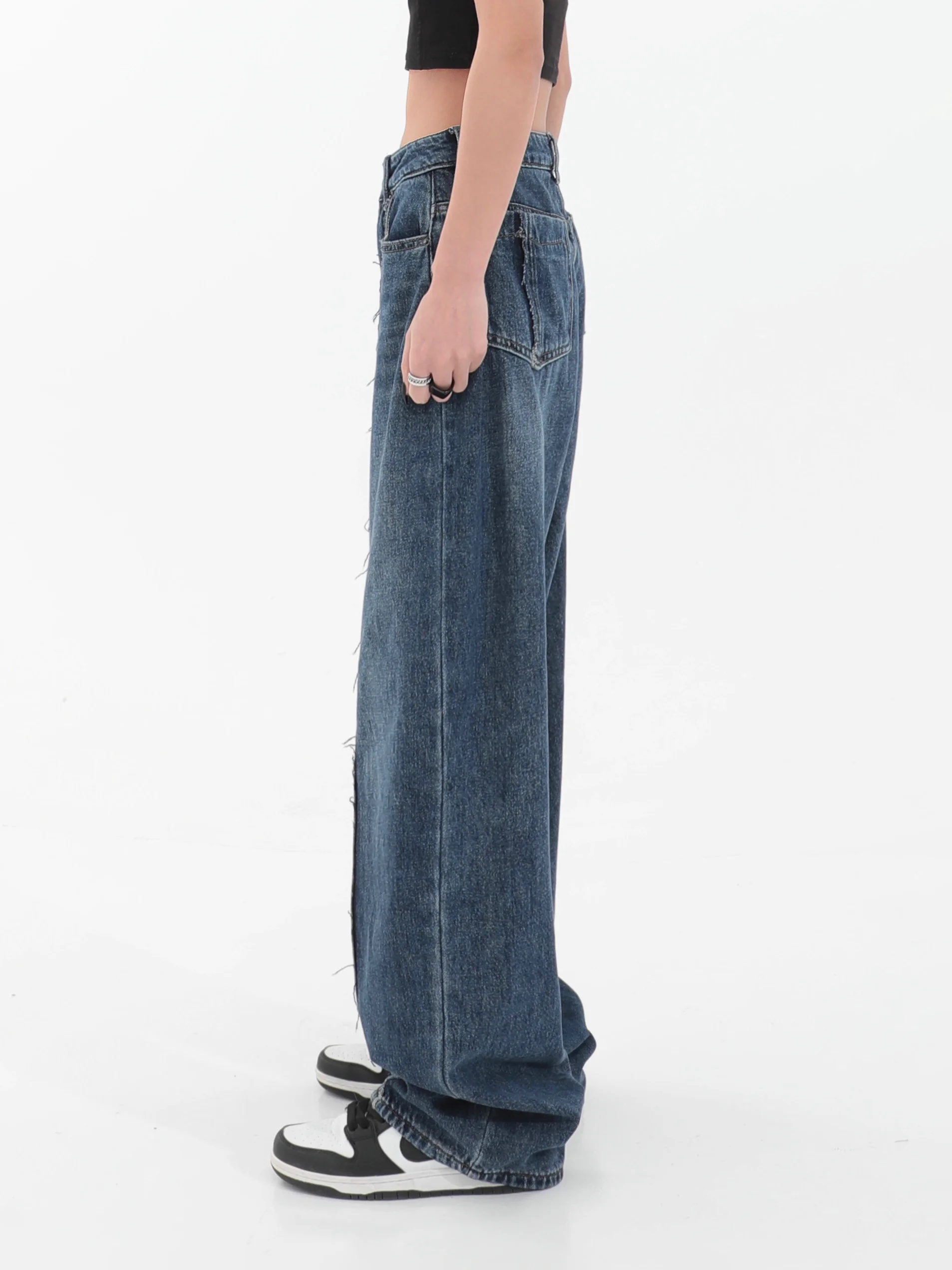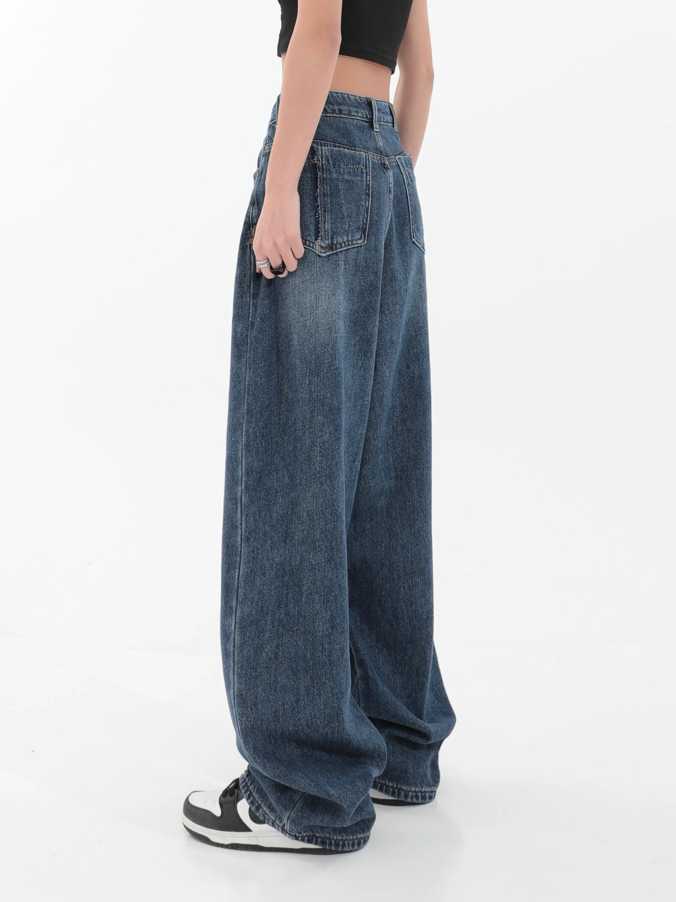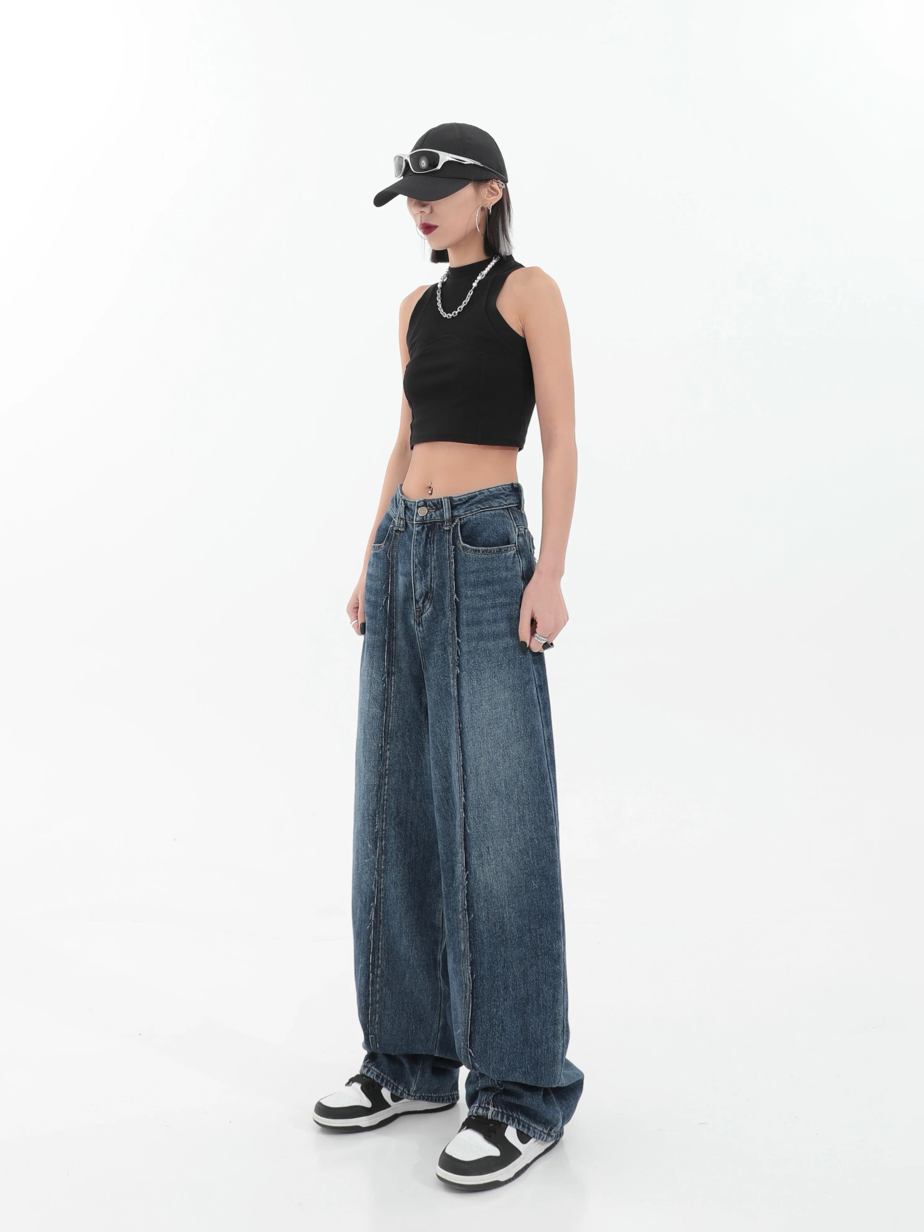 Dark Blue Womens Jeans High Waist Vintage Straight Baggy Denim Pants Streetwear American Style Fashion Wide Leg Denim Trouser